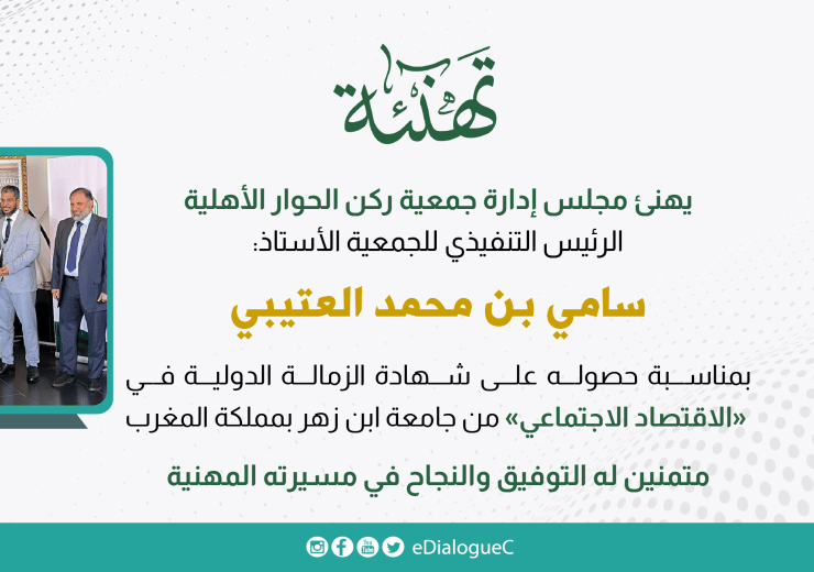 تتقدم أسرة ركن الحوار بأطيب التهاني والتبريكات للأستاذ: سامي العتيبي...