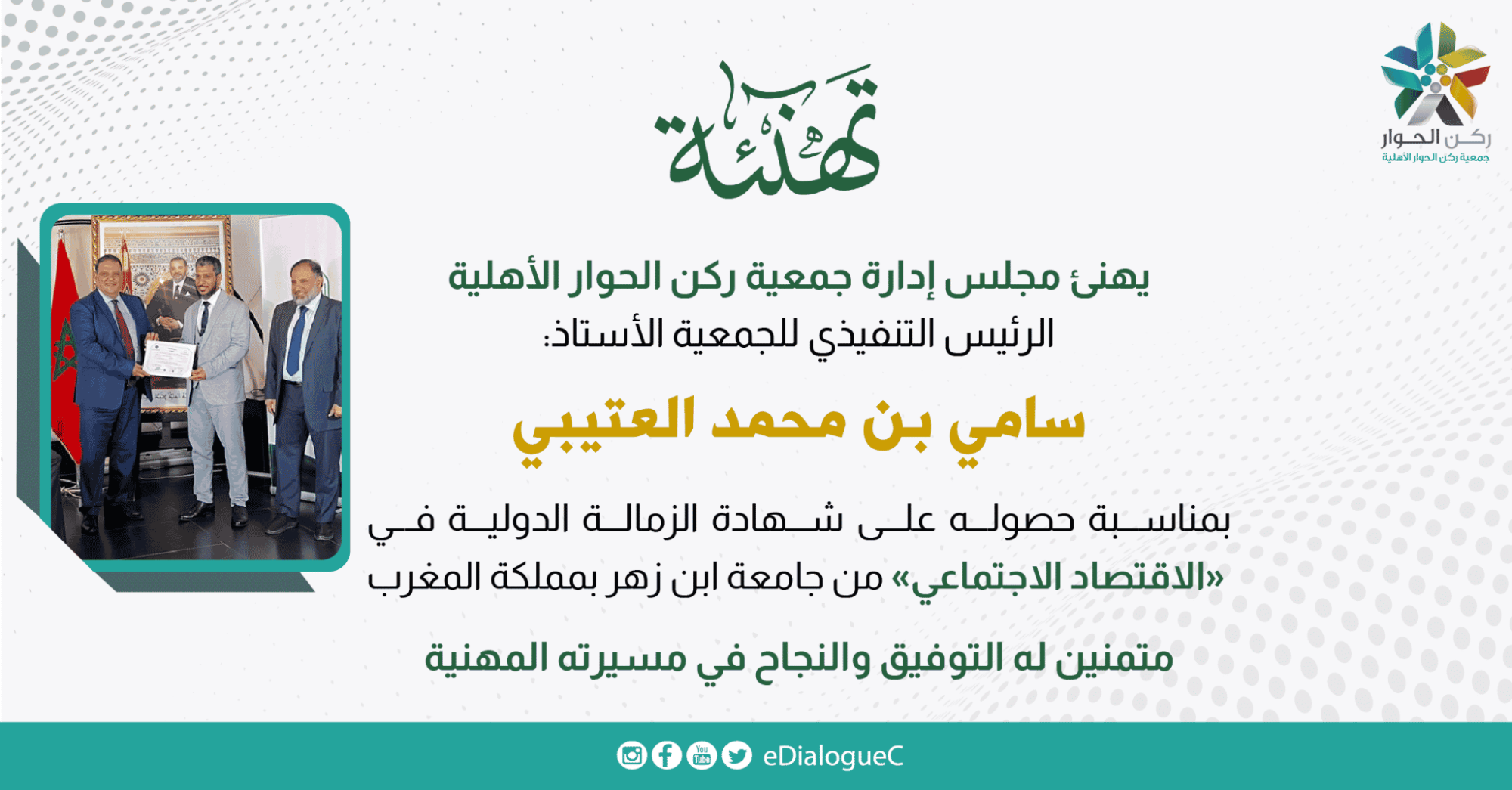 تتقدم أسرة ركن الحوار بأطيب التهاني والتبريكات للأستاذ: سامي العتيبي – الرئيس التنفيذي لجمعية ركن الحوار