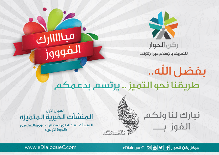 أعلنت الأمانة العامــة لجائزة الســبيعي للتميــز فــي العمــل الخيري النتائــج النهائيــة للجائــزة فــي الــدورة الأولى ، وتمكن بفضــل مــن الله مركــز ركــن الحوار فــي الحصول علــى المركز الأول فــي مجــال المنشأت الخيرية المميزة فــي القطــاع الدعــوي والتعليمــي.